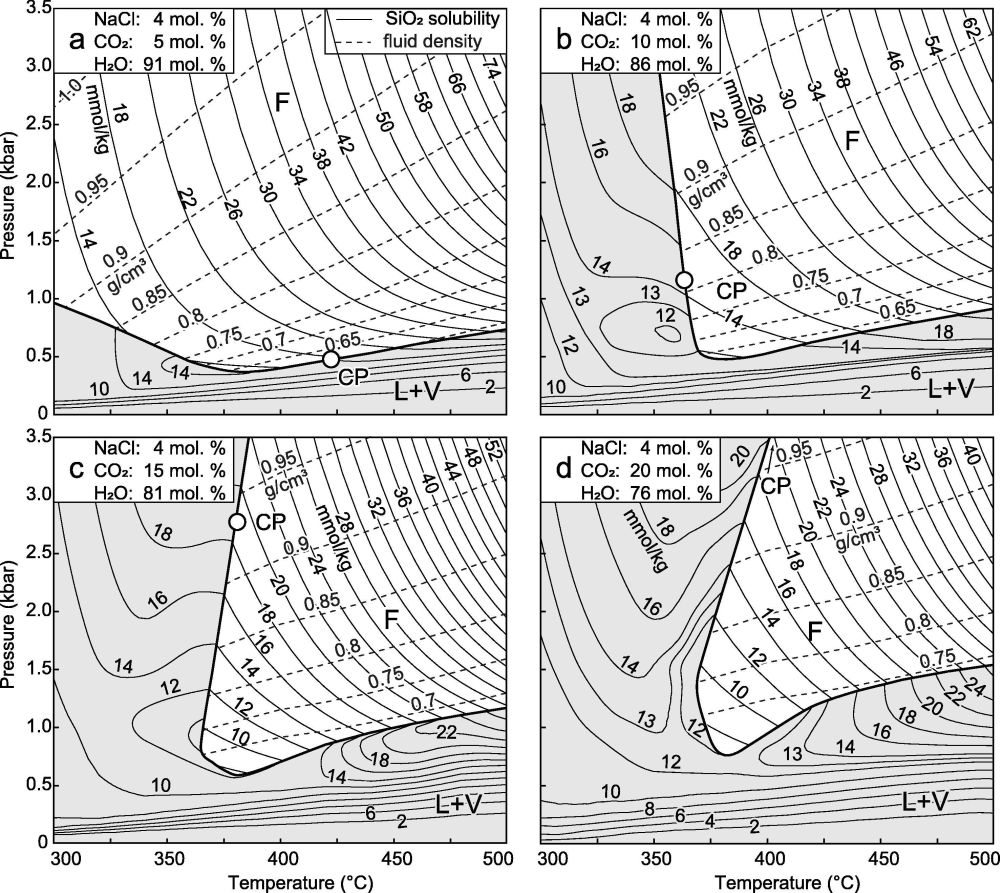 (2)石英溶解度受温度、压力和CO2含量影响,随着降温、降压和CO2含量增加,石英溶解度降低,但在L+V区或相边界局部区域存在着相反的行为(retrograde)。石英溶解度在低温时受压力影响小,在高温时受压力影响大,同理,在低压时受温度影响小,在高压时受温度影响大(图3);