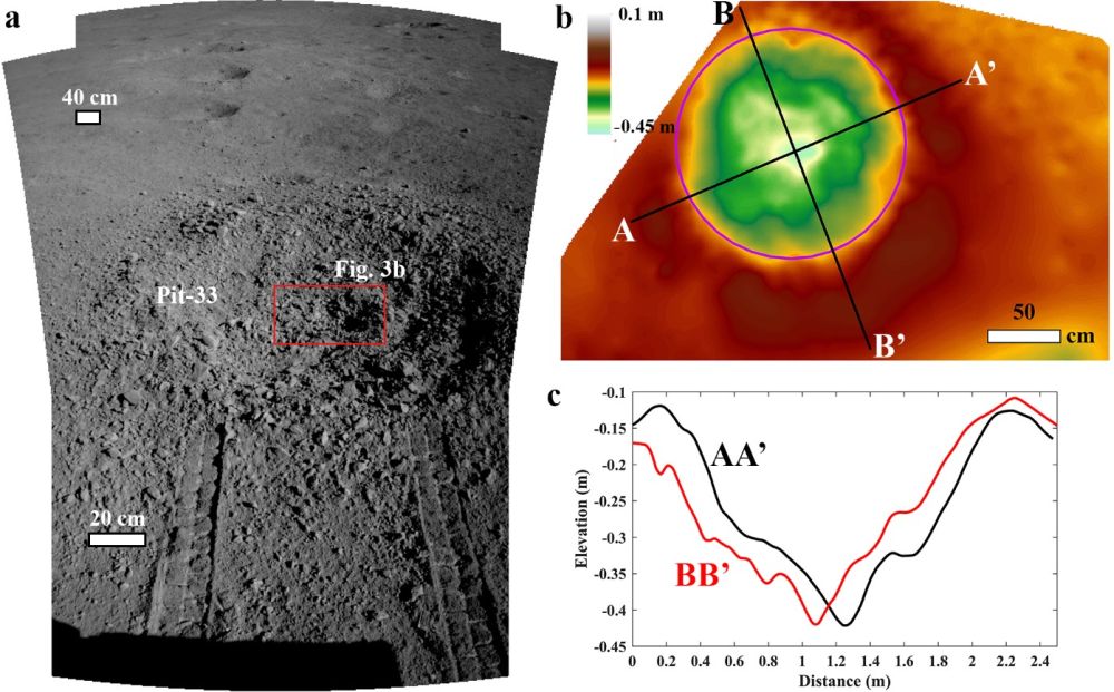 2019年1月3日,我国“嫦娥四号”探测器在月球背面的冯·卡门撞击坑成功着陆。着陆后,“玉兔二号”月球车利用搭载的全景相机、探月雷达、导航相机、避障相机和可见-近红外成像光谱仪对着陆区进行了详细探测,发现月球表面有许多小陨石坑,多数被细粒月壤覆盖,石块很少。不过,在任务的前12个月昼里,月球车在行驶路径上还观测到了45个以上随机分布的小坑,它们直径达几米,覆盖有大量碎块(图1)。正常的陨石坑基本上没有石块分布,但这些“碎块”坑与普通陨石坑明显不同,科学家对此非常感兴趣,就指挥月球车对其中一个坑进行了详细探测(图2)。通过对这些探测数据的研究,中科院地质与地球物理研究所地球与行星物理院重点实验室林红磊博士后和林杨挺研究员及合作者们,获得了关于月球表面过程独特而重要的信息,并对月壤的形成过程有了新的认识。