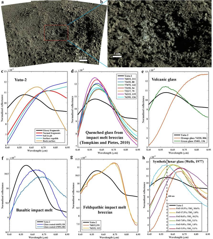 根据避障相机数据生成的高程数字模型,其中一个“碎块”坑的直径约为2 m,深约30 cm,坑底部有中央凹陷(图2)。探测数据表明,坑中的大部分碎块小于5 cm,坑内碎块与坑外月壤的光谱特征很接近,但与新鲜石块明显不同(图3)。此外,坑内月壤与碎块也有相似的光谱形状,表明它们具有类似的组成。在坑的中心,有一簇高反照率且呈现蓝绿色调(图3)的碎块,可能是玻璃碎片。玻璃碎片与同一坑内的月壤、普通碎块以及月表石块光谱明显不同(图3c)。玻璃碎片具有不寻常的高反照率,并在~600 nm显示出明显的反射峰,与撞击熔融或火山作用产生的玻璃光谱特征一致。根据阿波罗样品分析,只有当玻璃含量大于60%时,才能在玻璃/晶体混合物的光谱中观察到明显的玻璃特征。通过与阿波罗号样品比较(图3),可认为“玉兔二号”观测到的高反照率碎片是相当纯净的玻璃。与不同铁钛含量的玻璃对比,发现含9.0% FeO和1.0% TiO2的玻璃与月球车观测到的玻璃光谱反射峰位置最为接近,这与着陆区的低铁钛特征一致(~ 12.6% FeO,~1.4% TiO2)。