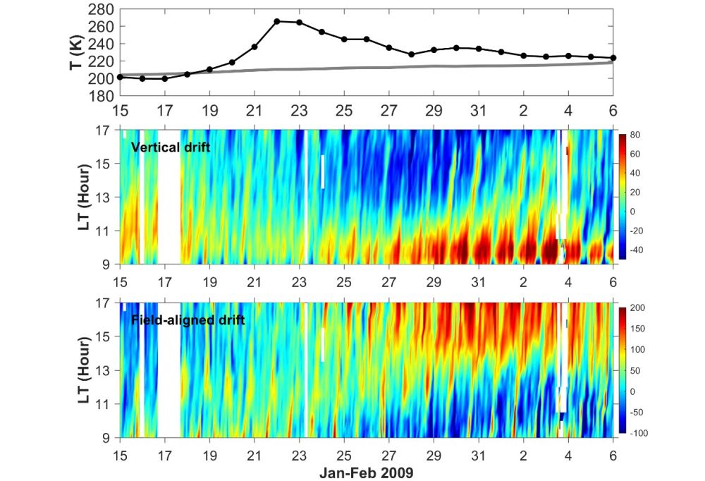 他们利用美国空军“通信/导航中断预报系统”卫星(C/NOFS)搭载的离子漂移计观测资料,发现在SSW期间,除了电场漂移,沿着磁力线方向的等离子体速度展示出显著的半日变化:在上午时段呈现南向的扰动,下午转为北向的扰动(如图3所示)。