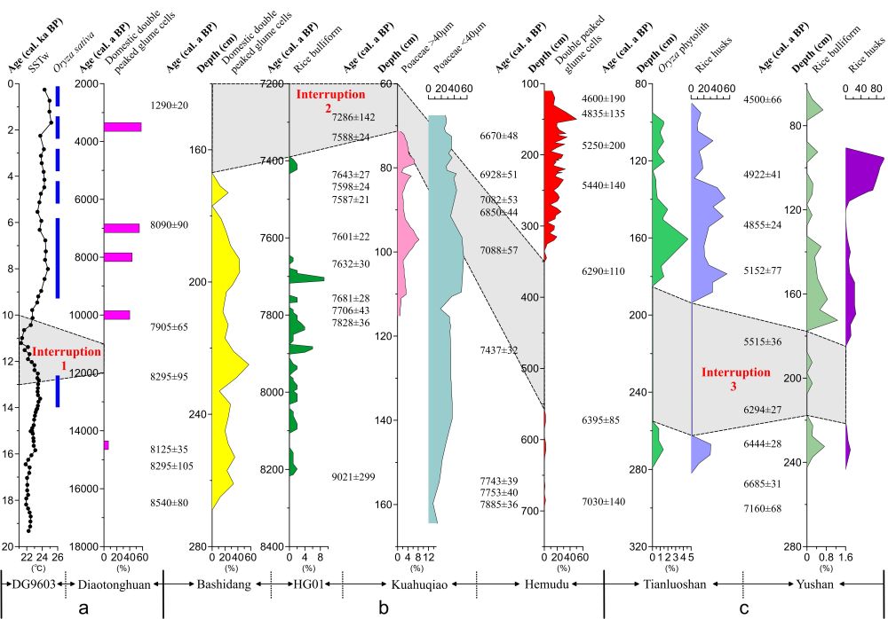 综合区域内的气候、海平面研究记录,他们发现第一次间断是由新仙女木事件(Younger Dryas)降温所导致的,而后两次事件则是中全新世海平面上升和波动所引发的海侵事件造成的。通过全球范围内的对比研究显示,西亚的小麦、大麦和中南美洲的玉米分别依托的是山麓和低地环境,而中国的水稻则是植根于长江中下游的低海拔湿地环境,更容易受到水环境变迁及极端事件的影响。尽管新仙女木事件也曾触发了西亚小麦栽培的开始,但造成后两次间断的中全新世海侵事件则是水稻所独有的,这些环境的不稳定性因素最终导致了水稻驯化完成时间的推迟。