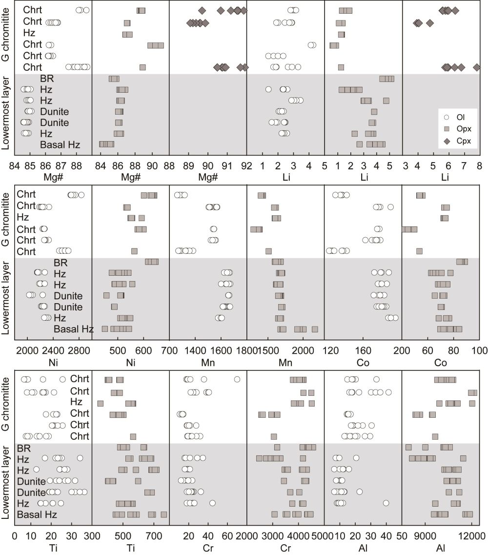 (2)斜方辉石和单斜辉石的化学成分更多地反映了演化岩浆的组分变化,在过渡族元素含量以及O-Cr同位素方面则明显受到铬铁矿的影响。