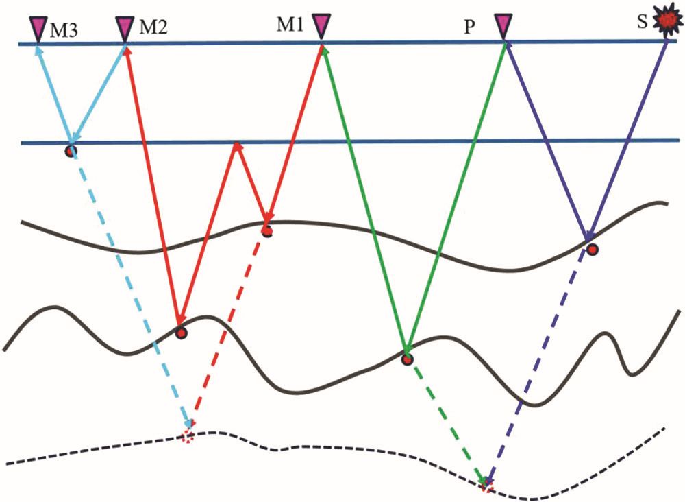 图1 地震多次波传播路径,M1, M2,M3表示不同阶的多次波,P是反射波。X1,X2多次波产生的crosstalk假地层界面