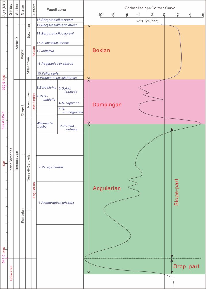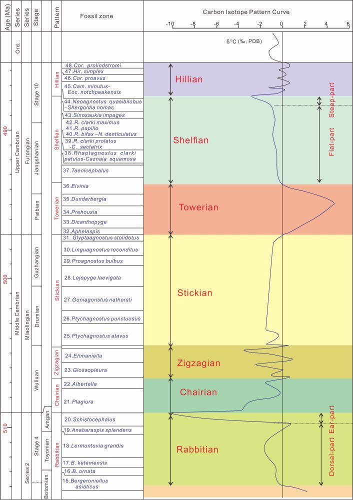 图2 (上)寒武系纽芬兰统和第二统下部的碳同位素变化型曲线,由3个变化型(Angularian, Dampingan, 和Boxian)组成,左侧为与国际年代地层表的化石带和年代地层单位阶的关系;(下)寒武系第二统上部和苗岭统、芙蓉统的碳同位素变化型曲线,由7个变化型(Rabbitian等)组成,左侧为与国际年代地层表的化石带和年代地层单位阶的关系