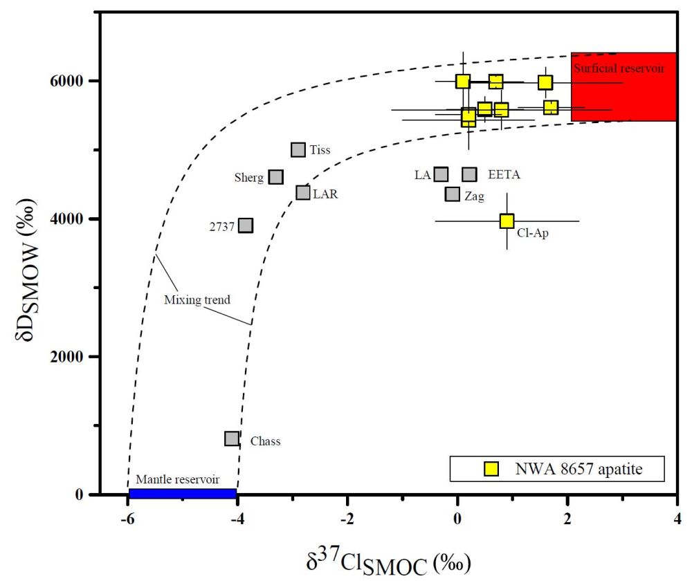图3 NWA 8657火星陨石中的磷灰石具有与火星浅表流体几乎相同的H和Cl同位素组成。Tiss: Tissint,Sherg: Shergotty, LA: Los Angeles, EETA: EETA 79001C, Zag: Zagami, Chass: Chassigny, LAR: LAR 06319。虚线:不同端元的混合线