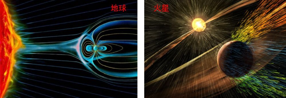图1 行星磁场对太阳风流的阻碍作用(左图自ESA,右图自NASA)