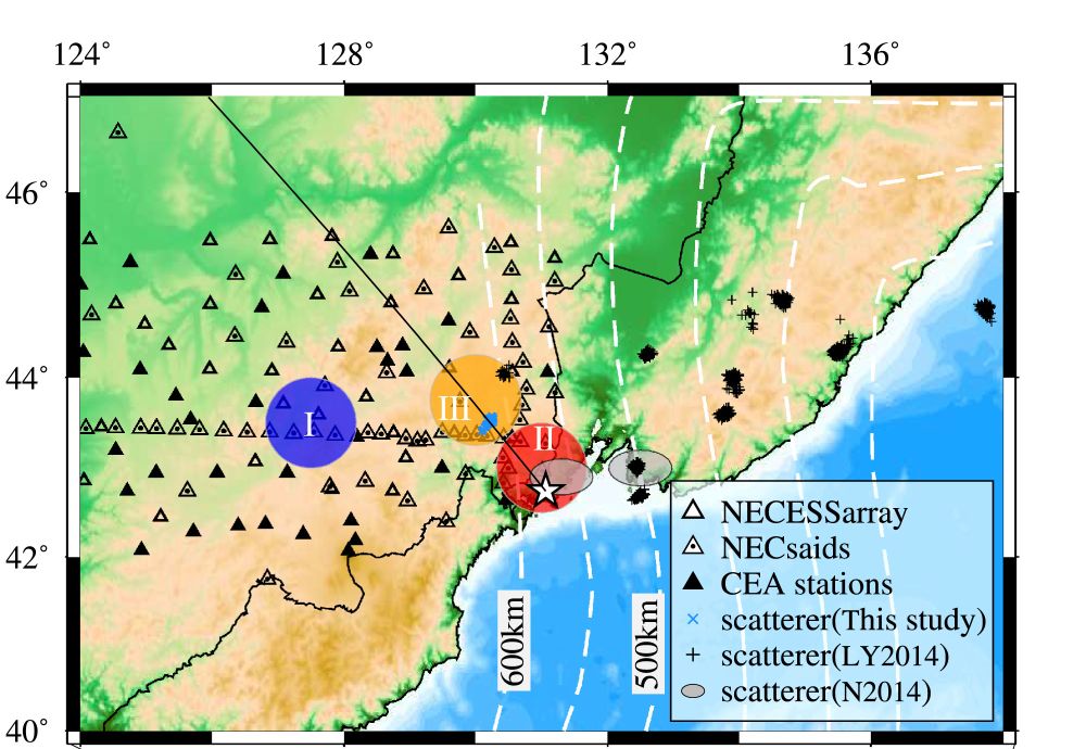 图1 用于研究的地震台站,主要由NECsaids和NECESSarray流动地震台阵以及国家地震台网构成。图中Ⅰ区域为参考区域,没有明显的下地幔散射体信号;Ⅱ和Ⅲ区为探测到下地幔散射体的区域