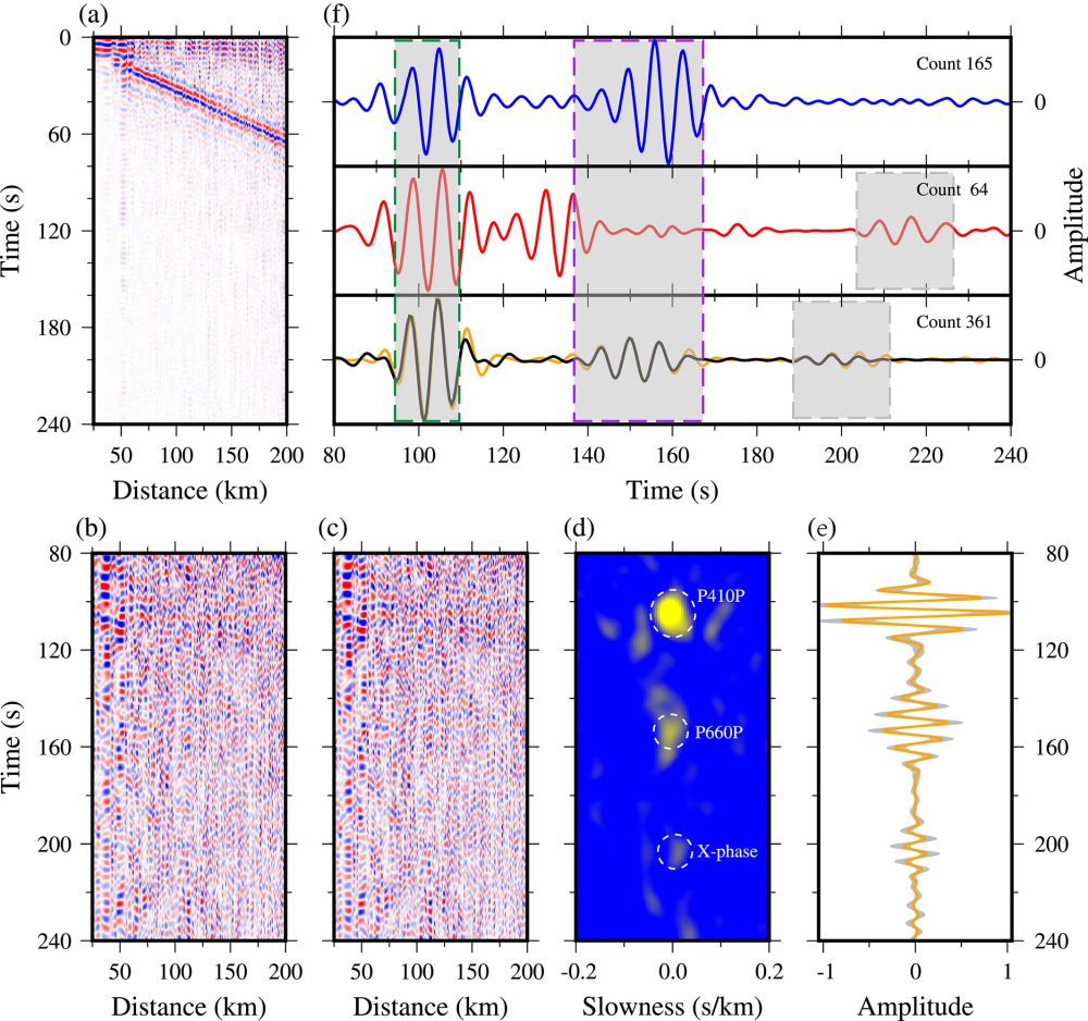 研究者们首次利用地震噪声互相关方法发现了源自下地幔散射体的反射波。NECsaids和NECESSarray流动台阵及国家数字地震台网为研究提供了很好的数据基础(图1)。在互相关函数叠加后的波形中,不仅清晰观测到地幔过渡带上下界面(410-km和660-km间断面)的P-P反射波,同时在部分相关曲线约200 s处发现了未知的X震相(图2)。为探明X震相的来源,他们独辟蹊径,联合利用天然地震事件和噪声产生的不同类型地震波,确证X震相为900-1000 km处下地幔散射体上的P-P反射波(图3)。他们还进一步利用波形拟合对下地幔散射体的物理性质进行联合约束,当S波、P波速度及密度异常分别为-7.2%、0.2%及0.6%时,理论地震图与观测结果拟合最佳(图2f)。这表明探测到的下地幔散射体可能源自俯冲并进入到下地幔的洋壳,很可能与古老的Izanagi俯冲板块在深部的残片相关。