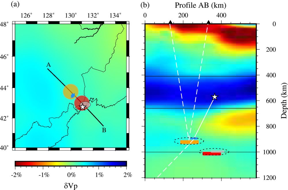 传统研究方法主要有S-P转换波法和反射前驱波法。其中,利用震源下方的S-P转换波法具有较高的分辨率(~10 km),但依赖于深源地震的分布,仅适用于探测深源地震较为发育的俯冲地区;反射前驱波法可以探测大陆下方地幔深部的散射体,但依赖于台站-地震分布,探测分辨率较低(~数百km)。800彩票地球与行星物理院重点实验室的张理蒙博士,在李娟研究员的指导下,与陈棋福研究员、南京大学王涛副教授等合作,基于地震干涉理论,发展了利用地震背景噪声提取微弱的下地幔散射体信号的方法,并成功探测到东北亚地区下地幔900-1000 km深度的小尺度散射体。