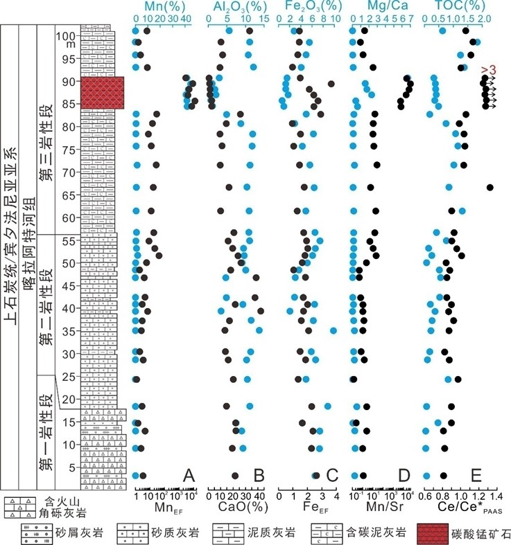 图2 上石炭统喀拉阿特河组所选取的主量元素及其相应富集系数(A)Mn和MnEF,(B)Al2O3和CaO,(C)Fe2O3和FeEF,(D)Mn/Sr和Ca/Mg比值,(E)TOC含量和Ce异常的地层剖面分布。富集因子相对于后太古代澳大利亚页岩(PAAS)计算