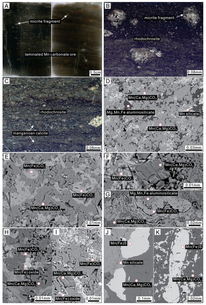图3 显微照片显示锰矿石的典型结构及组成。矿石多呈层纹状构造(A);矿石主要由菱锰矿(MnCO3,含量达95%以上)组成 (B-D);有的团块状菱锰矿(图3E)和菱面体状菱锰矿(图3F)被化学成分为Mn0.98Fe0.02CO3的菱锰矿胶结;有的具似叠层石构造(图3G);可见Mn(II)碳酸盐矿物交代Mn(III/IV)氧化物颗粒的现象(图3H),亦可见沿着锰碳酸盐矿物边缘发育的次生锰氧化物(图3I);亦见少量红铁锰矿、富锰绿泥石及硫锰矿(J-K)