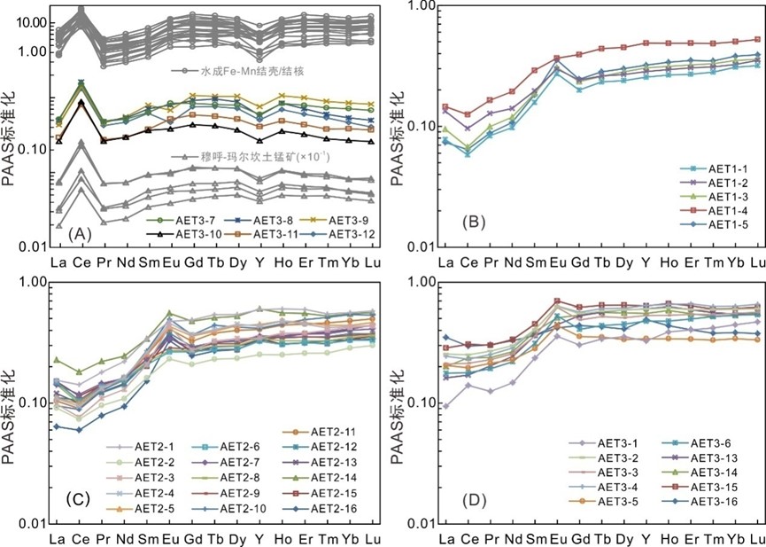 (3)碳酸锰矿石经PAAS标准化后的REE+Y配分模式与现代海洋水成铁锰氧化物沉淀物的典型稀土元素特征一致,如强烈正Ce异常(3.55±0.23)、负Y异常(0.73±0.04)和低Y/Ho比值(~20)(图2E,图4A)。而围岩具有类似现代海水的REE+Y分布特征(图4B-C),如轻稀土亏损、负Ce异常等,表明沉积过程发生在氧化水体环境。