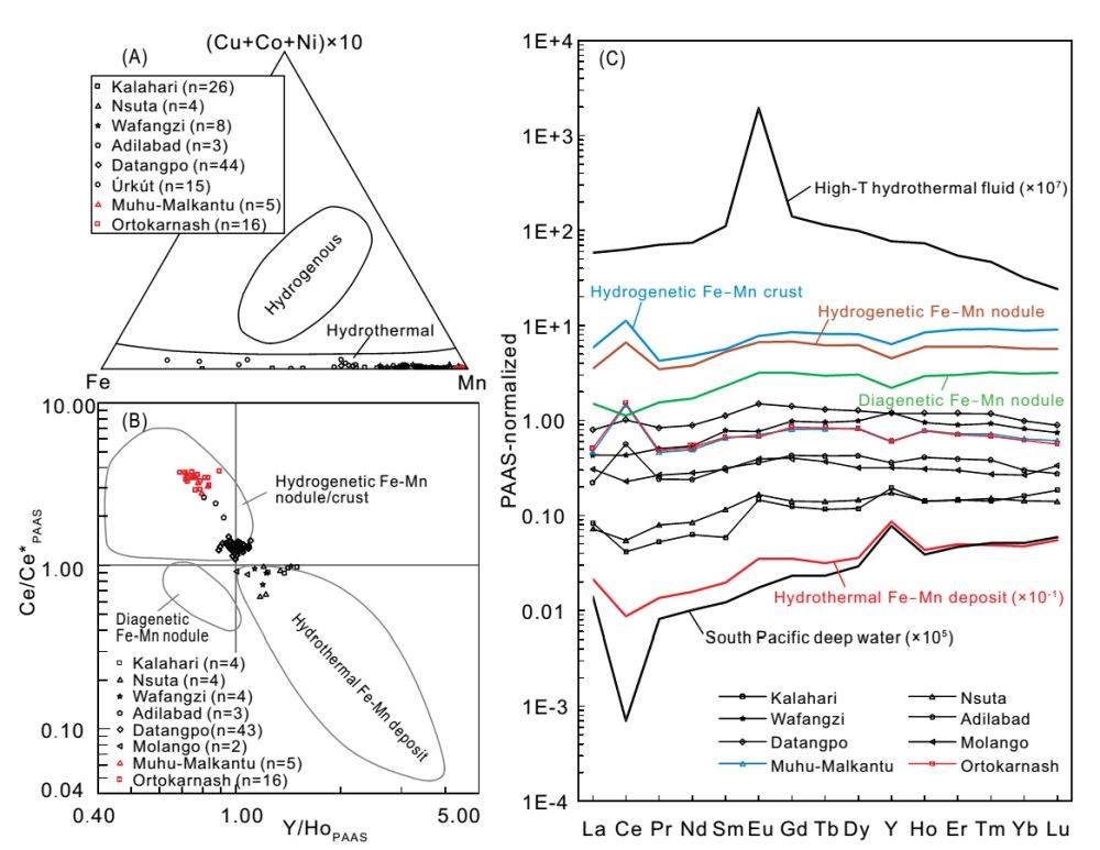 (5)奥尔托喀讷什锰矿与赋存在喀拉阿特河组中的其它锰矿床具有一致的地质地球化学特征。与全球主要碳酸锰矿床相比,奥尔托喀讷什锰矿独以菱锰矿为主,而其它矿床还会出现锰白云石、锰方解石等矿物。就元素地球化学特征而言,在Fe-Mn-(Cu+Co+Ni)×10图解中,所有的碳酸锰矿床具有一致的海洋热液铁锰沉积物特征(图6A)。但这些碳酸锰矿床却展现出截然不同的稀土元素特征,一组表现出海洋热液铁锰沉积物的特征,另一组表现为海洋水成铁锰沉积物的特征(图6B-C)。造成这种不同的原因可能是:Fe、Co、Ni、Cu等亲硫元素与Mn元素过早分离,造成喷溢海水中的热液独富Mn;Mn2+以锰氧化物形式发生沉淀的速率不同;锰氧化物在成岩转化为碳酸锰的过程中有元素流失。