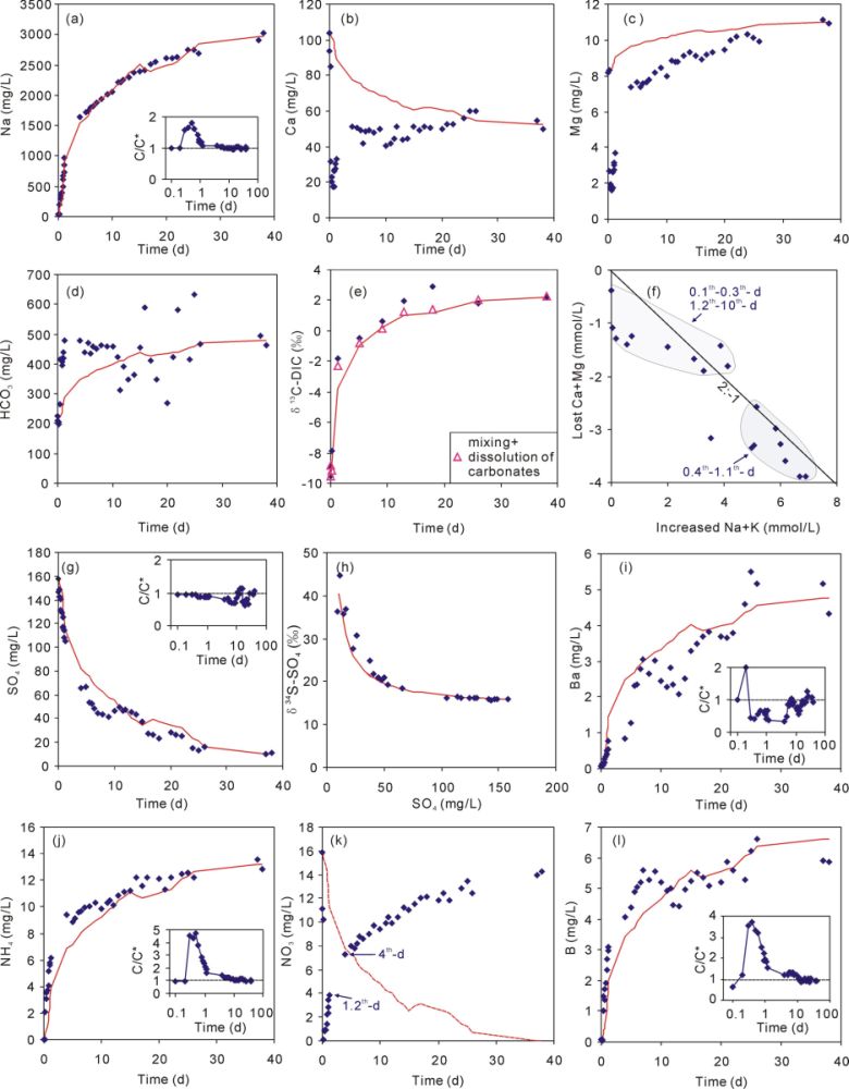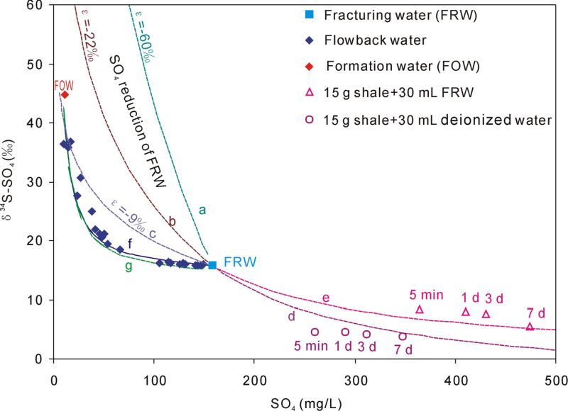 研究结果显示返排到第37-38天,返排液已经不含氚且14C含量低于6.5 pMC(压裂液氚含量为9.8 TU、14C含量为93.3 pMC),说明此时的返排液基本是地层水;通过计算发现返排到第4天时,地层水已经占到了返排液的50%,两周时占到80%(图1);返排液的水化学组成整体上受控于压裂液和地层水的混合作用。除此之外,在返排初期(1-2天内)和室内水岩反应实验中,均发现了明显的阳离子交换、离子吸附与解吸附作用、重晶石沉淀等反应(图2)。虽然在室内水岩反应实验中(包括前人实验),黄铁矿氧化作用十分明显,但在现场压裂及返排中,这一过程并不明显。结合硫同位素和地球化学计算,发现返排液中硫酸盐的减少并不是由前人认为的硫酸盐还原或沉淀作用造成的,而只是由地层水(硫酸盐含量较低)主导的混合作用所引起的(图3)。
