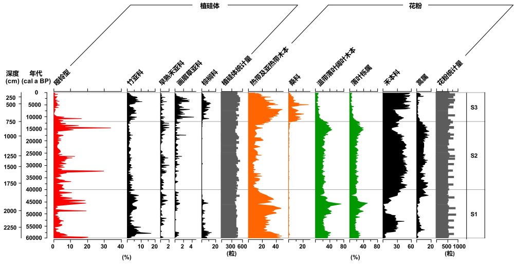 图2 湖光岩玛珥湖6万年来主要植硅体和花粉类型百分含量