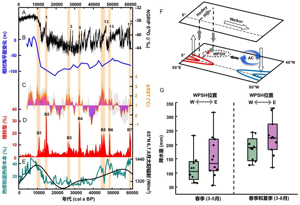 进一步研究发现,这7次哑铃型峰值代表的干旱事件的发生时间与间冰阶暖期(Dansgaard-Oeschger事件)1、3、5、12、13和17相对应(图4A),与过去认为的ITCZ在冷期(Heinrich事件)向南移动造成干旱的机制相矛盾,因此ITCZ迁移可能不是东亚热带地区水文异常的唯一机制。通过对比多个长尺度热带太平洋SST的重建结果发现,哑铃型峰值与热带太平洋自西向东的纬向SST梯度增加一致(图4 C和D)。研究认为,热带西太平洋SST升高,增加了Walker环流强度,减弱了东部太平洋的大气对流,从而在北太平洋形成反气旋,有利于WPSH向西延伸;同时,热带西太平洋增温加强了东亚Hadley环流,进一步加强WPSH和抑制东亚夏季风,从而延缓了WPSH的北移,最终减弱了来自海洋的水汽(图4F)。现代气候观测记录表明,在WPSH向西移动的年份,湖光岩地区的春季和夏季降水显著低于WPSH向东移动的年份(图4G)。