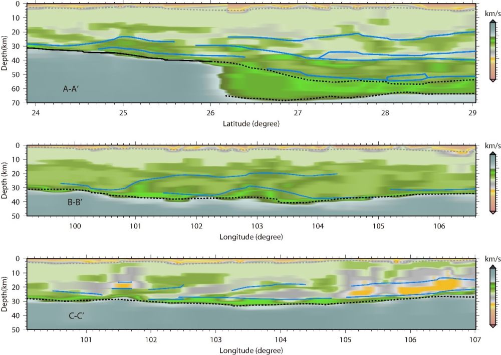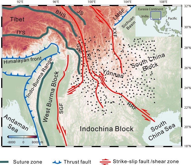 | 中国云南地区位于东扩的青藏高原和新生代以来强烈伸展的东南亚之间。根据地表构造和变形观测,通常认为青藏高原隆升导致向东的块体挤出,或是下地壳通道流是云南地区新生代构造演化的成因。中科院地质与地球物理研究所的研究人员全面分析了云南地区密集地震台阵的地震记录,通过对地壳结构的地震成像研究,集前人地质、地化和上地幔结构研究的见解,提出:青藏高原东扩仅影响了云南北部地区新生代的构造演化,云南中部和以南地区的地壳被印度板块俯冲作用所改造。 |
