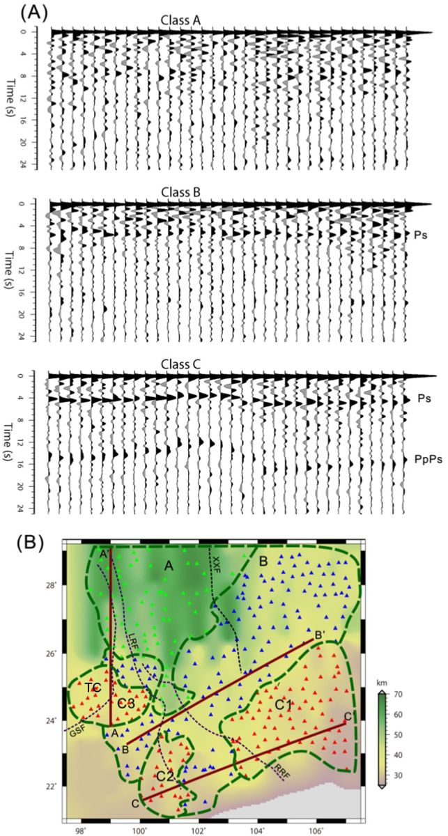 图2 (A)接收函数波形的区域性变化;(B)A、B、C类接收函数相应的台站分布分区。红色线段表示地壳结构成像(图3)的剖面位置