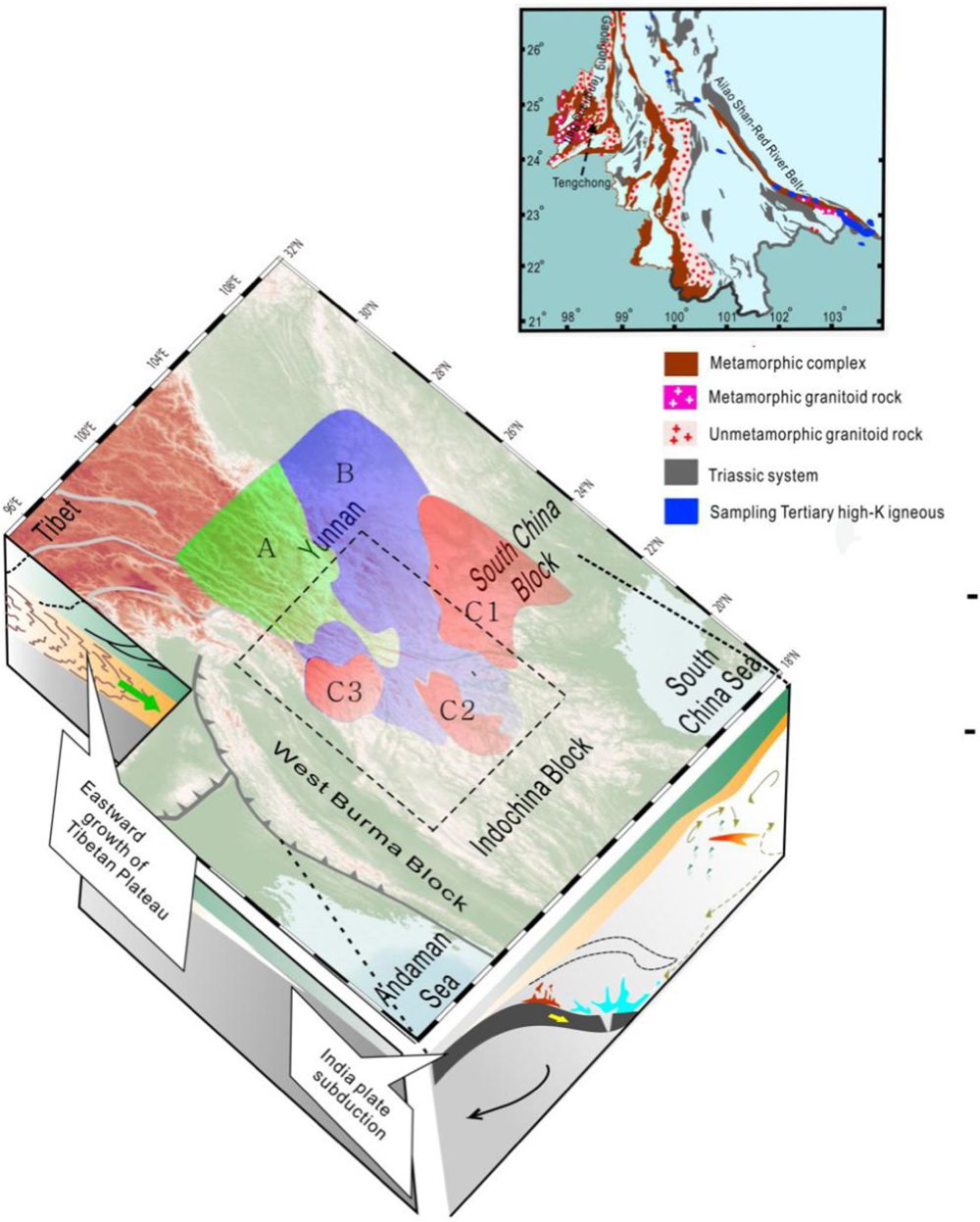 采用对接收函数的波形反演和深度域结构拟合的综合成像技术,他们重建了三类区域的三条剖面的地壳S波速度结构。结果清楚展示了不同区域地壳厚度,低速区分布,以及壳-幔过渡带结构特征的显著差异(图3)。为理解这一地壳结构特性的构造含义,作者进而跟踪有关岩石圈厚度和上地幔速度差异分布的地震学研究结果,大区域构造演化的地质学研究结果,以及新生代岩浆作用的地球化学研究结果,提出了对形成云南地区地壳结构这一显著差异的构造背景解释(图4)。作者认为,云南地区地壳结构的空间差异是经历不同演化过程的结果。青藏高原东扩改造了北西云南的地壳,而其余地区则是印度板块俯冲造成软流圈地幔上涌与边缘流导致地壳熔融以及壳幔相互作用的结果。