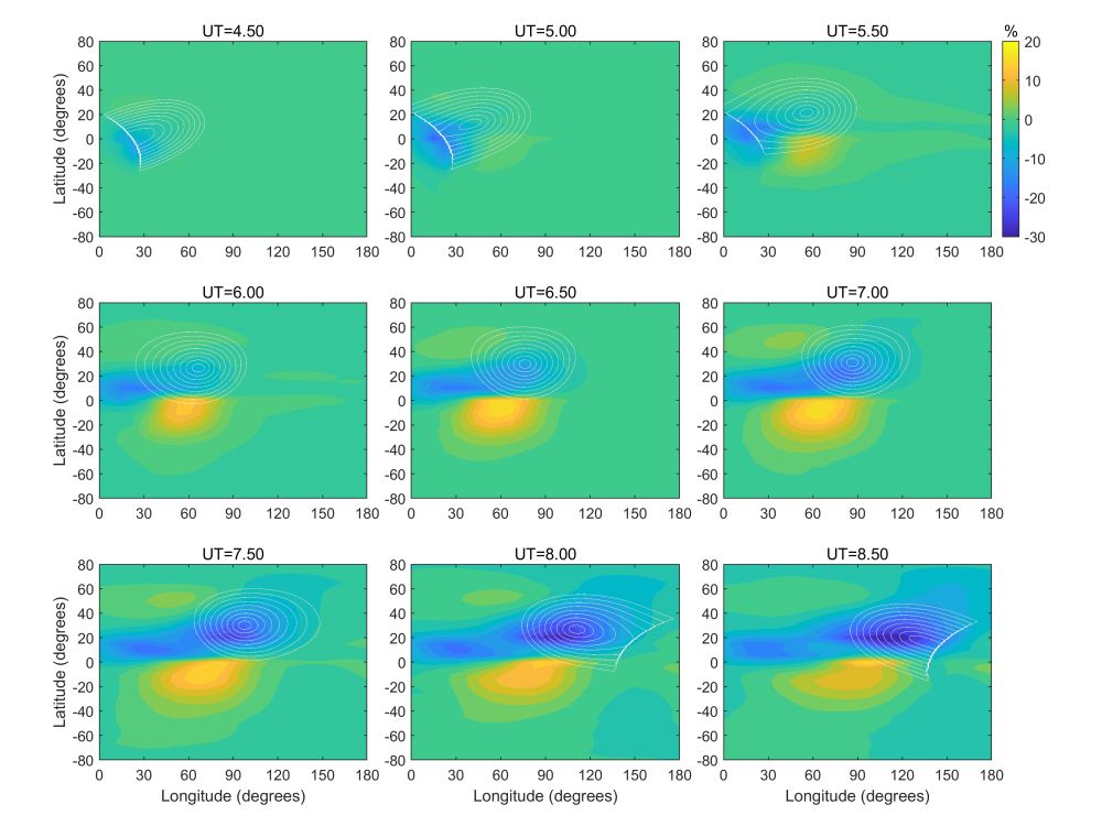 日食是一个独特的天文现象,日食期间太阳辐射大幅降低,引起一系列大气层和电离层的变化。日食引起的电离层变化从上世纪七十年代就开始被关注了。由于月球的遮挡,日食期间地球上部分区域高层大气接收到的太阳极紫外和X射线辐射大幅下降,电离层的离子产生率和加热率均显著下降,引起电离层光化学、动力学过程等一系列变化,导致电离层热层的密度、温度、风场等出现显著扰动。但是以前的研究认为日食是一个局部现象,对地球大气层和电离层的影响主要集中在日食阴影区特别是全食区附近。2018年7月北美洲的日全食覆盖了美国大部分区域,在此次日食的观测模拟研究中有学者提出了日食期间电离层扰动不局限于日食区,日食可能会引起更大范围甚至是全球的扰动,哪些物理过程对这种更大范围电离层扰动起主导作用值得深入研究和探讨。
