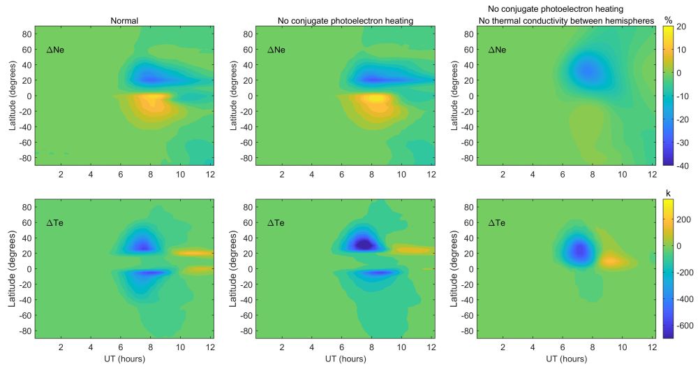 日食期间引起电离层电子温度快速变化的驱动过程主要有两种。一个是光电子沿磁力线的跨半球输运,另一个是沿磁力线的热传导过程。日食期间,日食区的太阳辐射大幅下降,光电子产生率显著降低,从而导致本该输运到共轭半球的光电子数量也大幅减少,引起共轭区的光电加热率下降;同时,日食区本身的电子温度由于光电加热的消失而大幅下降,这种降温过程也可能通过热传导过程传递到共轭半球,引起磁共轭点的温度下降。那么是哪种过程起主导作用?作者通过两个控制模拟实验,研究了耦合半球电离层扰动的主要原因,即分别切断了跨半球的光电子传输和热传导过程。模拟结果表明,共轭半球的电离层扰动是由跨层光电子输运、热传导和热层风变化的综合作用引起的。