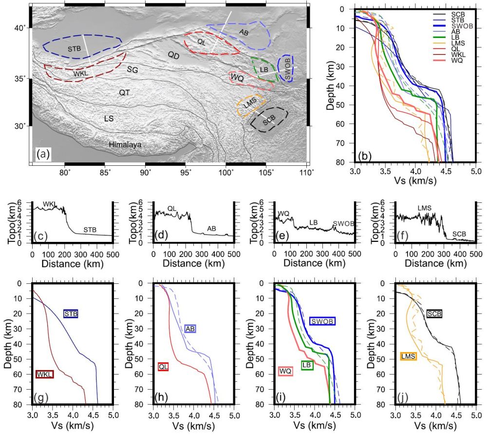 图3 高原边缘与周边块体地壳S波速度对比。STB:塔里木盆地南缘;SWOB:鄂尔多斯盆地西南缘;WKL:西昆仑;LMS:龙门山;其他缩写见图1的注释。(a)高程剖面(白虚线)和用来计算平均速度的区域范围(不同颜色的闭合曲线)的位置分布。S波速度主要来自Yang et al. (2012); (b)和(j)中的橘色和黑色虚线所示的S波速度来自Liu et al. (2014); (b)、(h)和(i)中的淡蓝色、绿色及蓝色虚线表示的S波速度来自Wang et al. (2017)