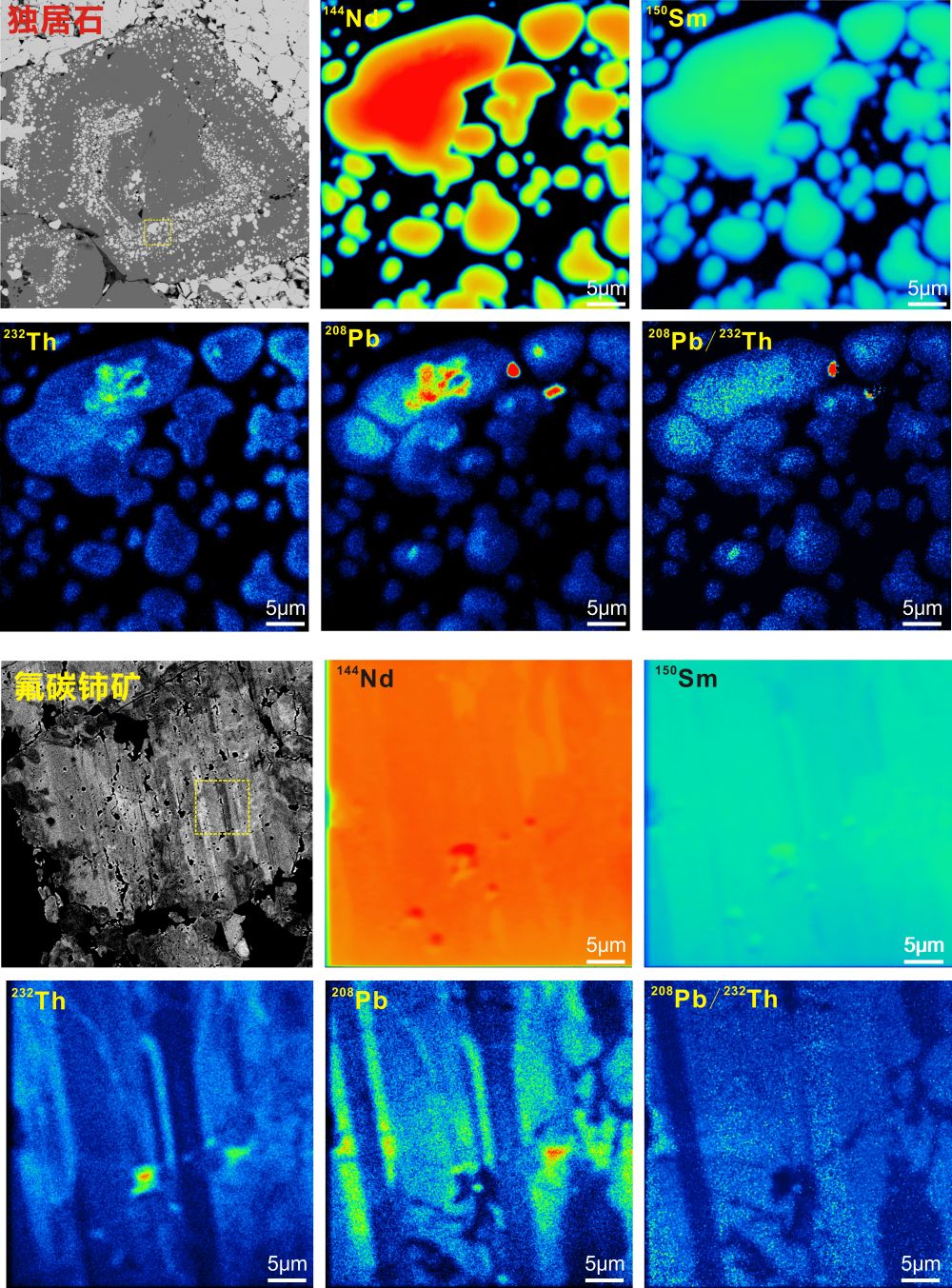 图2 独居石和氟碳铈矿NanoSIMS元素扫描图,可见Sm和Nd分布相对均一,但是Pb及208Pb/232Th分布复杂,说明热液改造过程中Sm-Nd同位素体系相对稳定,Th-Pb同位素体系被扰动
