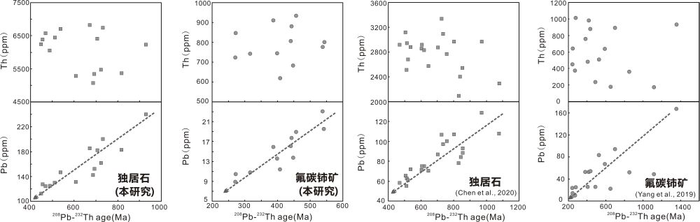 图5 Pb含量随Th-Pb年龄减小而降低,说明矿物热液改造过程伴随不同程度Pb丢失
