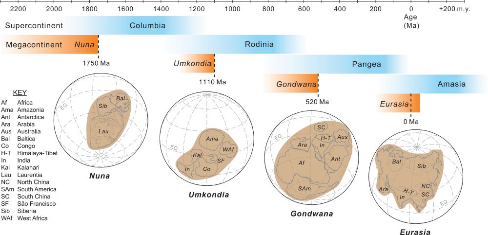 800彩票岩石圈演化国家重点实验室博士后王冲与Ross Mitchell研究员、彭澎研究员、加拿大圣弗朗西斯泽维尔大学Brendan Murphy教授和加拿大皇后大学Christopher Spencer博士合作,通过对超大陆重建的分析,识别出了古元古代以来地球上出现的类似于冈瓦纳的大陆,并将其称为“巨大陆(Megacontinent)”。它们分别是预测未来出现的阿美西亚超大陆对应的欧亚巨大陆、潘吉亚超大陆对应的冈瓦纳巨大陆、罗迪尼亚超大陆对应的乌肯迪亚巨大陆和哥伦比亚超大陆对应的努纳巨大陆(图2)。分析表明,超大陆形成之前的~1.5至2亿年都会存在巨大陆,巨大陆是超大陆的“雏形”,是超大陆的聚合相。巨大陆形成之后,大洋关闭,巨大陆与其他大陆碰撞形成超大陆,暗示二者之间的时空关系,如冈瓦纳在南半球高纬度形成,随后向北迁移,随着大洋的关闭成为潘吉亚超大陆的一部分。
