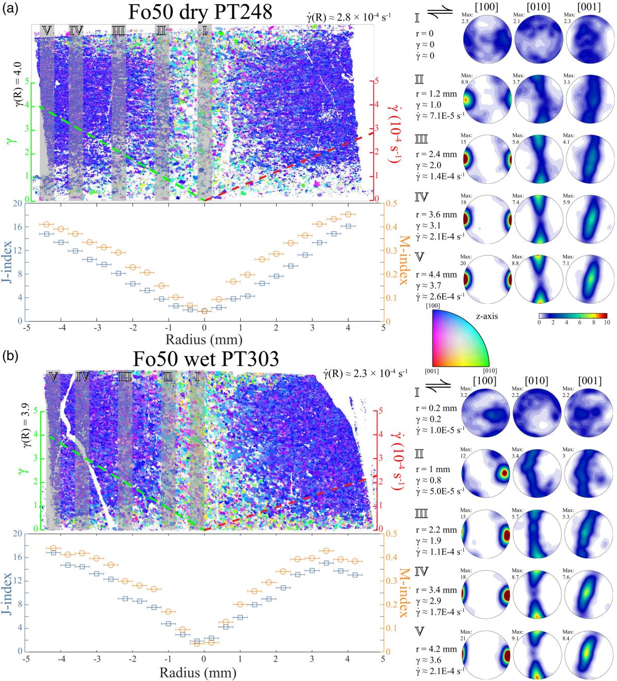 图1 变形的Fo50样品的CPO。(a)无水条件;(b)含水条件。在每个小图中,左上方为径向截面的显微结构图,左下方为不同半径位置的CPO强度(J-和M-indexes)图,右方为不同半径位置的晶轴分布极图。在显微结构图上,晶粒的晶轴取向以颜色表示,剪应变和剪应变率分别以绿色和红色间断线画出。对每一个选择的半径位置,表示[100]、[010]、[001]轴取向的极图所用的数据取自以这一半径位置为中心,0.4 mm宽的范围,在显微结构图上以灰色带标出。极图为下半球投影。所有晶格取向数据都经过了转动,使得剪切方向为上方向右