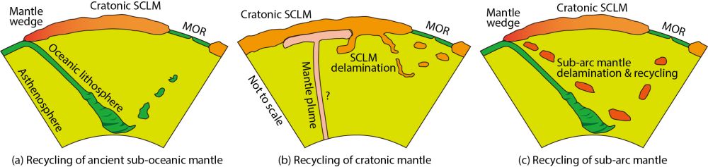 软流圈是地球内部一个“承上启下”的圈层。软流圈地幔在大洋中脊被动上涌而发生减压熔融,形成的熔体向上抽取进入岩浆房并经历一系列演化后形成洋壳,熔融的残留即为大洋岩石圈地幔。根据大洋中脊玄武岩(MORB)较为均一的化学成分,早期研究推测地幔对流可有效导致软流圈化学组成的高度均一化。然而,最近20多年深海橄榄岩的同位素研究成果表明软流圈在不同尺度上存在高度的不均一性。其中,最为瞩目的成果是利用Re-Os和Lu-Hf同位素在深海橄榄岩中识别出古老的(Re亏损模式年龄高达20多亿年)、超亏损的(εHf值高达+200以上)地幔组分,指示其经历非常古老的部分熔融和熔体抽取事件。这些古老的熔融事件的发生显然远远早于现今大洋的扩张时代(小于200 Ma),因此软流圈中的古老地幔被看作再循环进入大洋中脊的组分。然而,目前对软流圈中古老地幔组分的来源和成因还缺乏约束,主要观点包括:(1)通过俯冲作用再循环进入软流圈的古老大洋地幔,(2)通过拆沉或地幔柱热侵蚀再循环进入软流圈的大陆岩石圈地幔,(3)受俯冲影响拆沉进入软流圈的古老岛弧地幔楔(图1)。