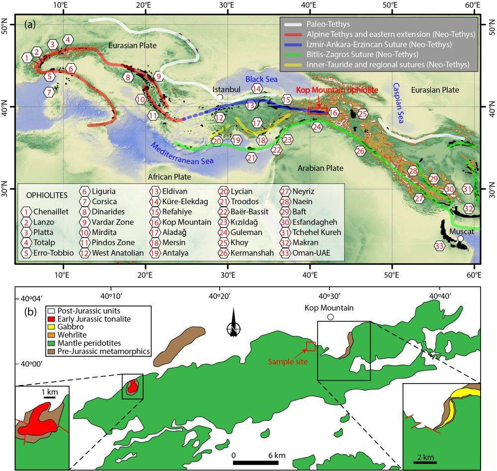 图2 新特提斯缝合带西段蛇绿岩分布、Kop Mountain蛇绿岩位置(a)及地质简图(b)