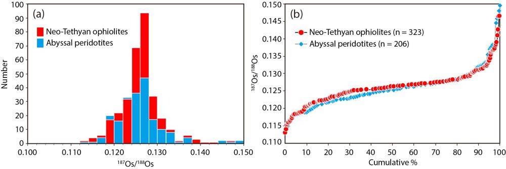 图3 新特提斯蛇绿岩地幔橄榄岩与全球深海橄榄岩的Re-Os同位素分布的统计学对比