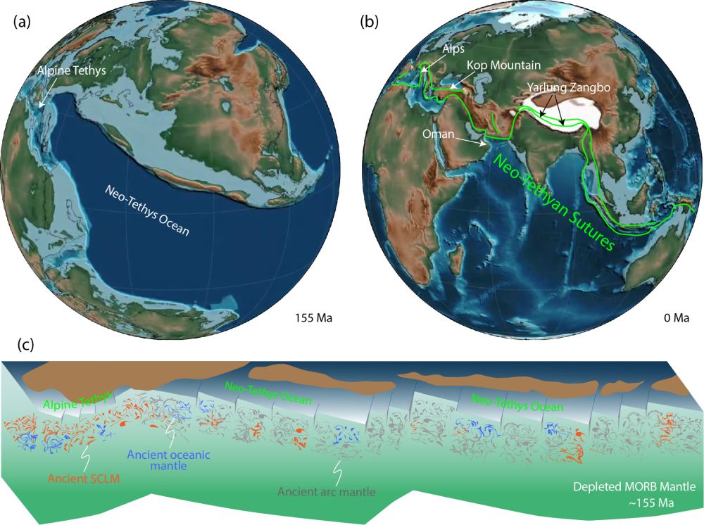 图4 新特提斯在地质历史上的演化、缝合带位置(a-b)及其软流圈的不均一状态和再循环的古老地幔性质(c)