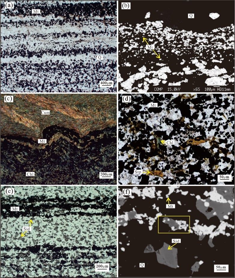 图1 大孤山BIF各沉积矿物相特征。(a)氧化物相中富硅条带和富铁条带由不同比例的磁铁矿(Mt)和石英(Q)组成(单偏光);(b)氧化物相中半自形细粒状磁铁矿散布于石英颗粒之间(背散射);(c)硅酸盐相中,主要由镁铁闪石(Cum)组成的富硅条带,局部可见绿泥石交代镁铁闪石(正交偏光);(d)硅酸盐相中可见片状黑硬绿泥石(Stp)与磁铁矿、石英共生(单偏光);(e)碳酸盐相中,富硅条带和富铁条带界线明显,条带宽度约0.2-1mm,其中富硅条带主要由细粒的菱铁矿和石英组成,富铁条带以磁铁矿为主要矿物,并含有少量石英和菱铁矿(单偏光);(f)碳酸盐相中,磁铁矿交代菱铁矿(Sid)(背散射)
