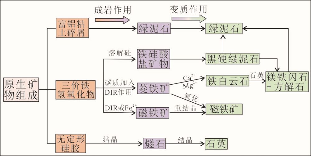 他们还通过系统的岩相学观察,确定菱铁矿形成于成岩期;结合菱铁矿碳同位素特征,认为其为成岩过程中原始沉积的三价铁氢氧化物经微生物铁异化还原而形成的产物。进一步通过所含矿物之间的相互关系,最终推测三价铁的氢氧化物和硅质应为最主要的原生矿物,在后期的成岩和变质作用过程中逐渐转变成为现今我们所见的含铁硅酸盐矿物、菱铁矿和磁铁矿等(图2)。