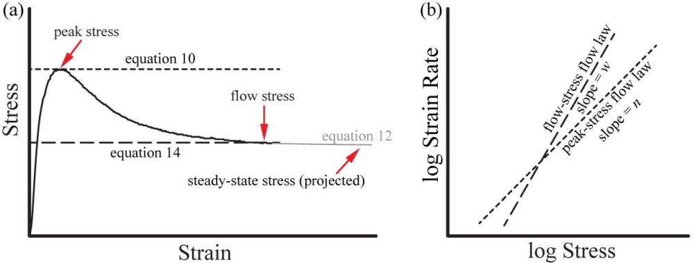 冰川与冰盖中冰的流动被广泛认为是由位错蠕变这一变形机制所控制的。位错蠕变是一种应变率与应力的n次方成正比,与晶粒尺寸无关的变形机制。过去,研究者广泛认为n的经验值为3。然而,更多的实验室数据发现n的值应为4。这种n值上的差异很可能是不同研究者实验方式或数据采集方式的不同所导致的。如图1,在peak stress(小形变量)采集的力学数据反映了材料在均匀、各向同性的显微结构下的流变学性质;而在flow stress(大形变量)采集的力学数据则反映了材料在各向异性的显微结构下的流变学性质。