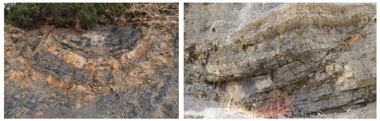 图2 川藏铁路规划线路沿线典型各向异性岩体。(左)红拉山隧道出口;(右)嘎益隧道进口