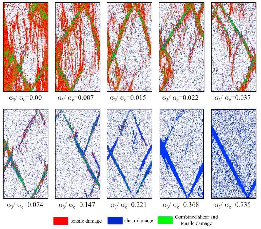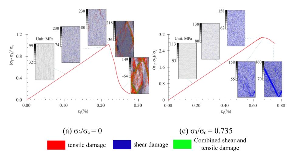 针对以上问题,页岩气与地质工程重点实验室郭松峰副研究员、祁生文研究员等人开展了研究。他们发现,岩体在高围压下以剪切裂纹为主,在工程开挖扰动状态条件下,随着径向卸荷围压降低,张剪性裂纹逐渐占主导(图3)。研究表征破裂的声发射事件发现,原位高围压情况下岩体的破裂主体发生在峰值强度前,且岩体破坏呈现延性特征,而在扰动卸荷围压降低情况下,岩体的主破裂集中发生在应力应变曲线的峰后下降段,呈现急剧的脆性破坏特征(图4),在工程中常常表现为岩爆等剧烈破坏。通过研究岩体破坏过程中局部应力分布发现,与未扰动高围压情况相比,岩体在扰动卸荷低围压情况下的局部应力集中程度明显增大,从而诱发了岩体张剪性脆性破裂(图5)。研究成果深化了对岩体材料因应力状态变化发生破坏的认识,揭示了工程开挖卸荷后高储能岩体的细观破坏机制,对工程扰动下非均质岩体破裂致灾防控具有一定的指导价值。