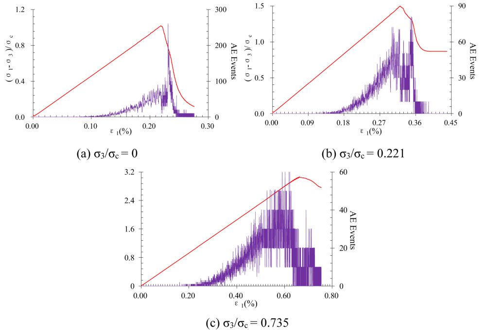 图4 不同应力状态下岩体应力应变曲线及声发射过程