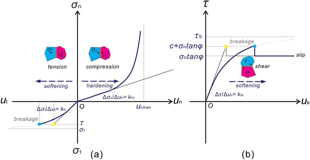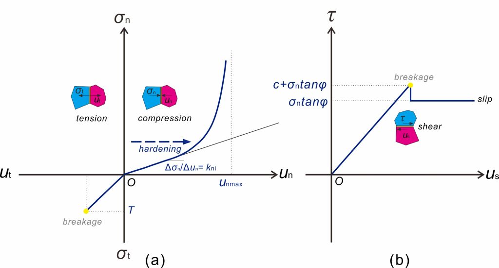 800彩票页岩气与地质工程院重点实验室黄晓林副研究员、祁生文研究员等人,基于离散元方法提出了一种先进的非线性粘结颗粒模型(Grain-based model)(AGBM)来定量刻画不同风化程度结晶岩的力学行为。以加拿大LdB花岗岩(微风化)、大渡河双江口(SJK)花岗岩(中风化)、理塘毛垭坝(MYB)花岗岩(强风化)三种不同风化程度的花岗岩作为研究对象,根据实际矿物组成、颗粒尺寸分布等,利用Voronoi算法生成凸多边形颗粒集合体并赋以颗粒不同的物理力学性质,以模拟花岗岩的矿物颗粒组构(如图1)。AGBM将风化作用下岩石微观结构的劣化处理为矿物颗粒间接触的松动,即接触刚度和强度参数的降低,压缩方向用硬化变形模型刻画,拉伸和剪切方向用线弹性变形模型刻画(如图2)。