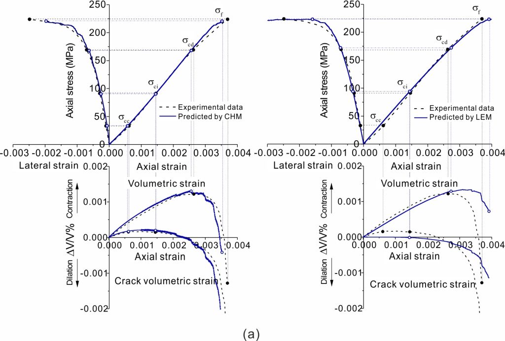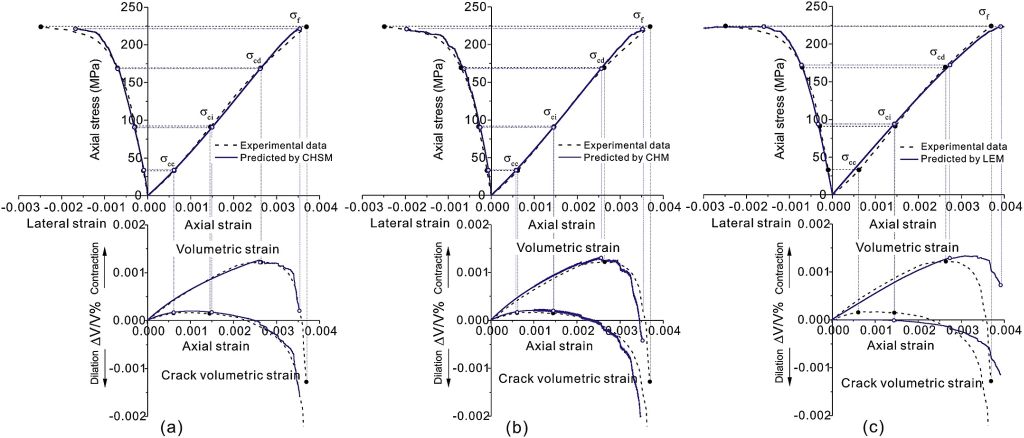 图3 三种不同风化程度花岗岩单轴压缩应力-应变响应的预测结果,左侧为AGBM的预测结果,右侧为传统线弹性模型预测结果。(a)微风化LdB花岗岩;(b)中风化SJK花岗岩;(c)强风化MYB花岗岩
