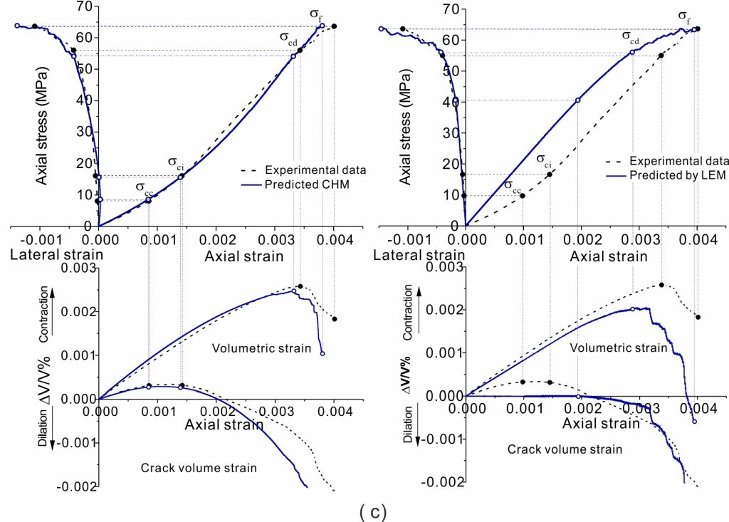 如图3,对三种不同风化程度花岗岩的单轴压缩实验结构进行模拟,发现微风化的LdB花岗岩矿物颗粒接触界面比较紧密且风化裂隙较少,单轴压缩应力-轴向应变曲线呈现近似线性特征,常规的线性模型和AGBM均能得到与试验结果相匹配的结果(如图3a);中风化的SJK花岗岩中部分矿物颗粒接触界面发生松动,风化裂隙增多,单轴压缩应力-轴向变形曲线呈现非线性特征,变形模量以及峰值应力等应力阈值较微风化LdB花岗岩降低,常规的线性模型预测结果显著偏离试验结果,而AGBM的预测结果与试验结果非常吻合(如图3b);强风化的MYB花岗岩中较多的矿物颗粒接触界面发生松动甚至填充,风化裂隙明显增多,单轴压缩应力-轴向变形曲线呈现明显的非线性特征,变形模量、峰值应力等应力阈值与LdB花岗岩、SJK花岗岩相比显著降低,常规的线性模型预测结果与试验结果相差较大,而AGBM的预测结果与试验结果非常吻合(如图3c)。由以上结果可以看出,传统的纯线性接触模型仅适用于新鲜或微风化岩石,具有明显的局限性,而提出的AGBM适用于不同风化程度岩石的微观结构对其宏观力学行为影响的定量刻画,具有显著的优势。