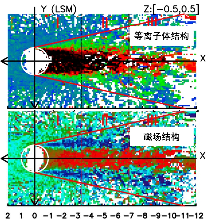 1 对称尾迹中的等离子体(上图)和磁场强度(下图)分布(Zhang et al., 2014