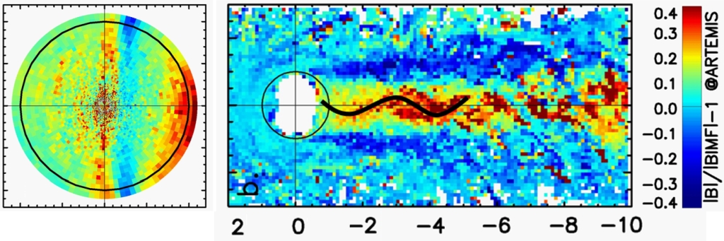 月球是等离子体的良好吸收体,从磁流体的角度看,太阳风冲击月球时,会被月球向阳面吸收,从而在月球背面形成等离子体空腔。月球又近似为绝缘体,行星际磁场可毫无阻碍地穿透月球进入到等离子体空腔中。此后,由于磁流体压强平衡需要,周遭太阳风会逐步回填到等离子体空腔中。回填过程会稀疏周边的行星际磁场,并挤压空腔中部的磁场使其增强。这些全球尺度的等离子体和磁场扰动构成月球尾迹。无论从等离子体还是磁场看,研究者都没有期待月球尾迹呈现关于太阳风的非对称结构(见图1)。