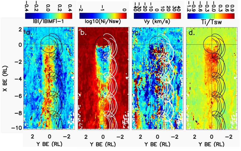 3 尾迹中磁场强度、等离子体密度、垂直速度和离子温度的分布。白/黑曲线为向阳面太阳风反射离子的漂移轨迹