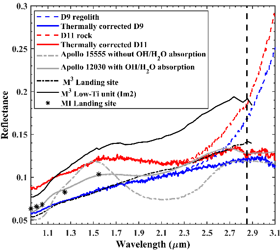 光谱技术是目前探测月球水及其分布较为直接的方式。羟基(OH)和/或水分子在光谱3微米附近具有明显的吸收特征。通过分析3微米附近的光谱特征,就可以识别月表水并获得水含量。当然,这里的“水”依然指的是指水分子或者羟基,因为目前获得的月球光谱遥感数据波段覆盖范围无法区分月表水是羟基还是水分子的存在形式。我们知道,月表温度在当地中午可达100℃以上,如此高温下月壤产生的热辐射会改变2微米之后的光谱形态,从而掩盖水的特征。因此光谱的热校正是研究月表水重要的一步,而获取准确的月表温度是光谱热校正的关键(图1)。月球LRO卫星的DIVINER探测器可以获取月表的温度,但都是利用热红外波长(>7微米)进行测量的,由于月表非等温性和不同波长的穿透深度不同,且真空条件下月壤层存在较大的热梯度,从以热发射为主的光谱波段估算的温度不能直接适用于2-4微米的区域。然而,由于在2-4微米的光谱区域,光谱仪接收到的反射和发射能量都占有很大比例,因此从光谱中准确估计温度是非常具有挑战性的。