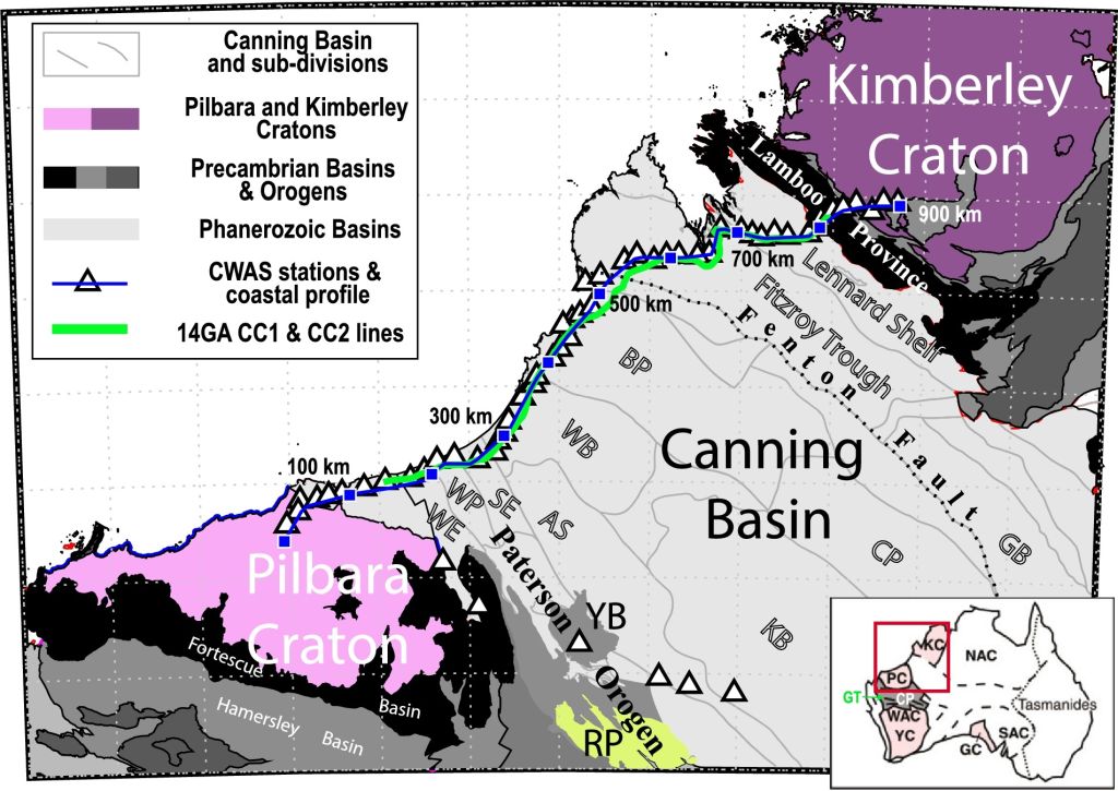 为理解早期板块构造动力学,800彩票联合澳大利亚麦考瑞大学和西澳大利亚地质调查局于2017-2019年跨越Pilbara克拉通北缘、Canning盆地、Kimberley克拉通南缘实施了中国-西澳地震观测计划(China-Western Australia Seismic Survey,简写CWAS)。该计划是本地区第一条大规模地震台阵剖面,总长度900公里,共布设58个三分量宽频带地震台,平均间距为15公里(图1)。为增大观测孔径,同时在西澳边缘印度洋地区布设了11台宽频带海底地震仪(CANPASS计划)。上述两项实验获得了大量高质量连续观测数据。