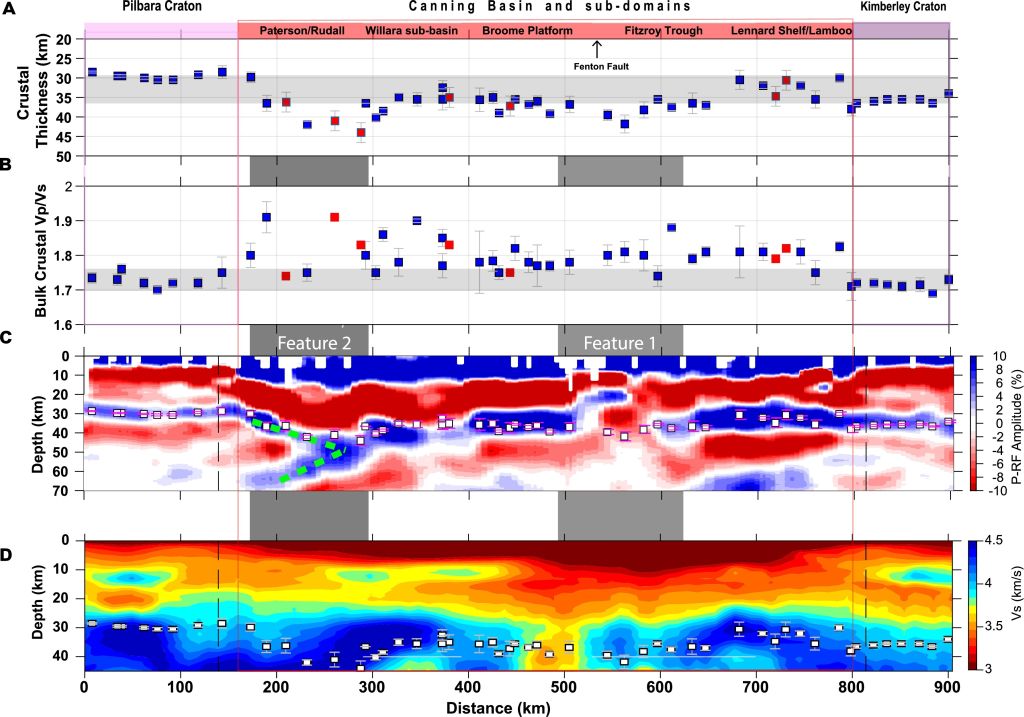 岩石圈演化国家重点实验室赵亮研究员、麦考瑞大学袁怀玉研究员和CWAS团队开展了地震波P波接收函数共转换点成像、H-k分析、噪音层析成像跨维度反演成像等多种方法研究,获得了观测剖面下方的岩石圈顶部结构和物性特征(图2)。多物理量约束的高分辨率观测结果揭示了Pilbara克拉通与Kimberley克拉通多阶段拼合汇聚遗留的构造特征,清晰指示了两个未知的与板块汇聚有关的倾斜古老上地幔结构:Pilbara克拉通南缘的Moho面延伸至70公里,结合区域地质和年代学限制,推断为19亿年前Pilbara克拉通拼合形成时的大陆深俯冲结构(图3);Canning盆地下方则为与13亿年前大陆碰撞有关的痕迹,只可见岩石圈最顶部的残留速度结构。