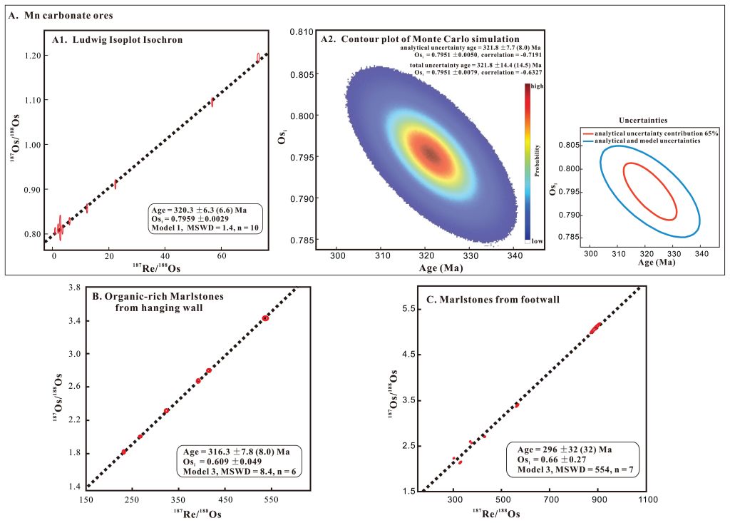 1  奥矿中碳酸锰矿石(A),上盘泥灰岩(B)和下盘泥灰岩(C)的Re-Os等时线。Re-Os等时线采用Isoplot  (A1, B and C)拟合。此外,锰矿石Re-Os定年同时采用Monte Carlo 方法拟合